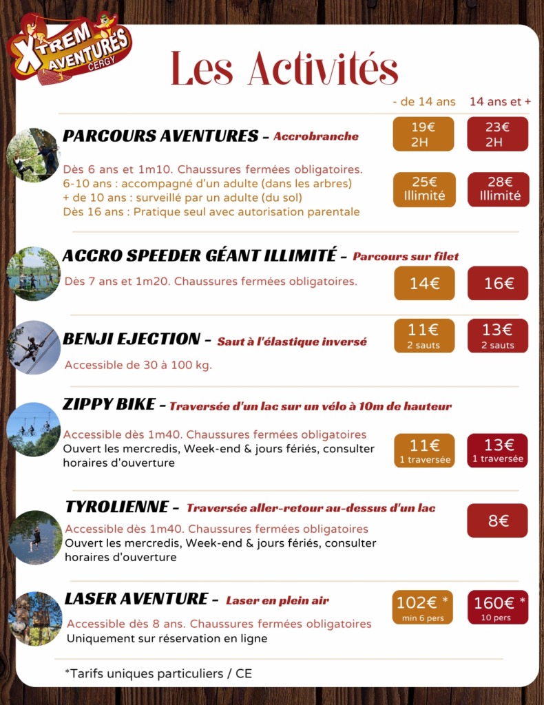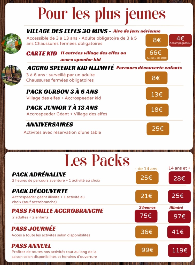 Dans notre parc, il n’y a pas de droit d’entrée, vous payez uniquement ce que vous allez faire. Vous pouvez prendre vos activités à l’unité ou bénéficier de nos packages afin de bénéficier de réduction.